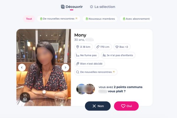 La section « Découvrir » est une page sur laquelle sont affichés des profils les uns à la suite des autres, à la manière des applis type Тinder. Pour chaque profil, on voit les infos principales à propos de la personne, puis on a le choix de dire « Oui » ou « Non ».